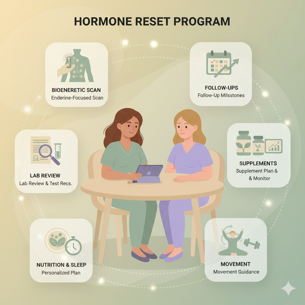 The Hormone Reset program pairs targeted bioenergetic analysis with nutritional, lifestyle and supplement strategies-plus collaboration with your medical providers when hormone replacement or labs are needed.